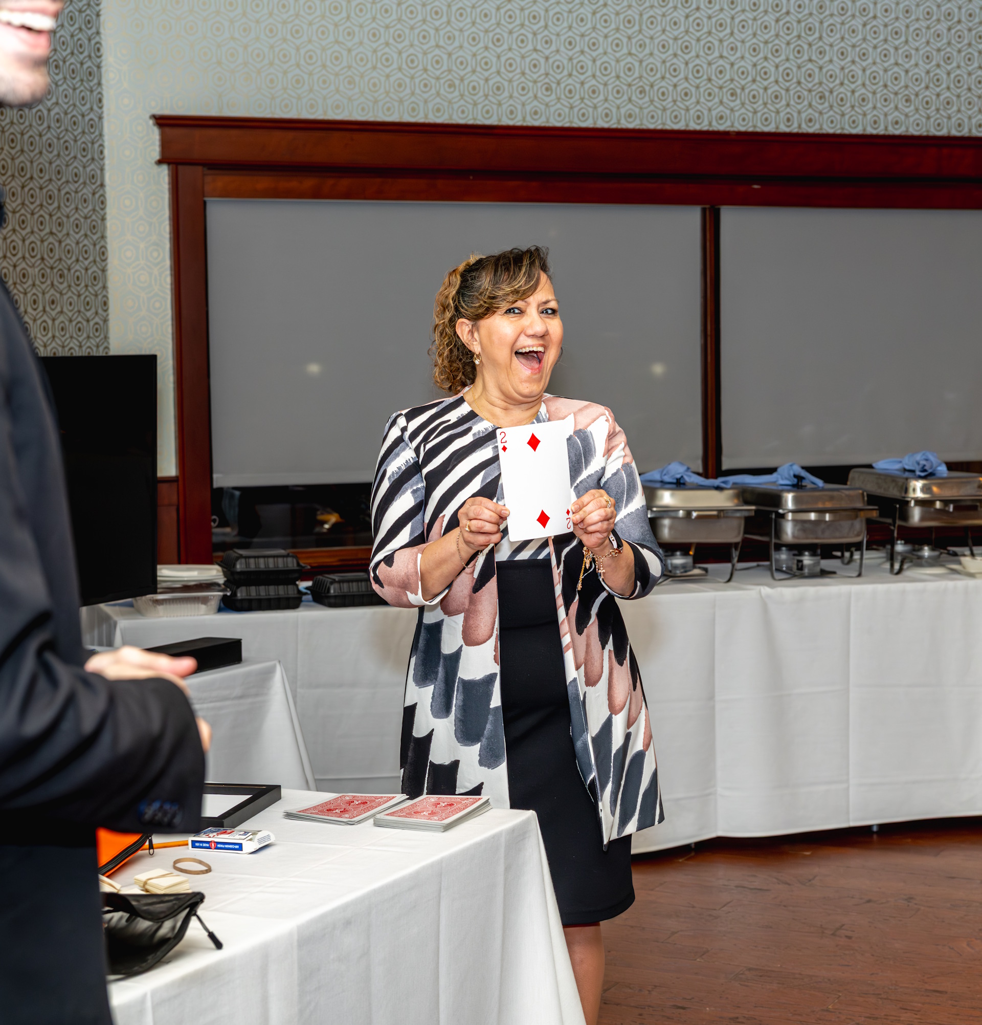 This photo shows a close-up shot of an audience member reacting during Jesse Dameron's show. She is holding a large-sized playing card as she smiles with amazement.